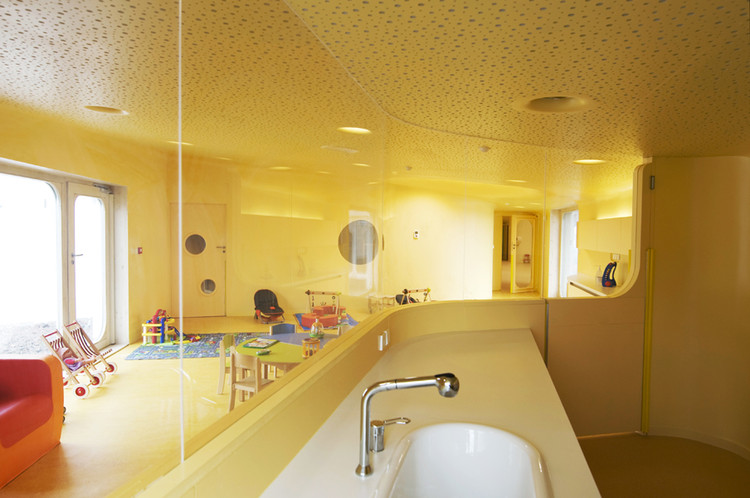 此外雨水管位于建筑側面,這樣家長們永遠不用抱起孩子跨過水溝。內部空間的組織都圍繞著高度安全的圓形中央空間,孩子們的空間圍繞并匯聚于此。每個相鄰的空間都彼此連通便于相互照料,最大程度的保證了安全。中心帷幕似的木結構最高處是3米寬的聚碳酸酯拱形天花板,保證室內全天都沐浴在充足的陽光之下。幼兒園設計