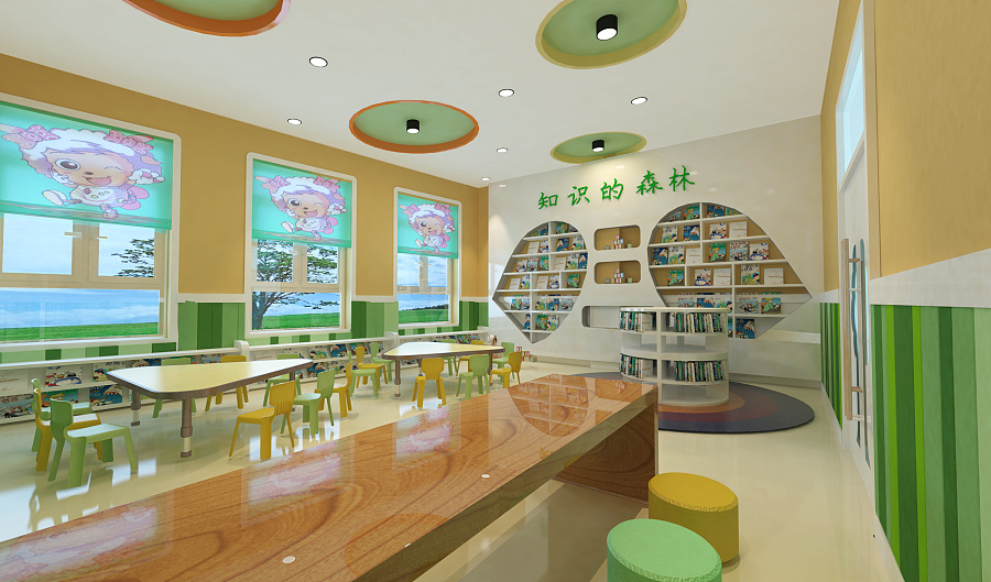 光滑干凈的長桌設計讓孩子們可以在鋪滿陽光的桌子上書寫畫畫的,明亮溫馨的環境孩子們也會更有學習的氛圍,孩子們圍著長桌一起讀書的畫面,想起來也是醉了,每個小細節的設計,卡通圖畫、簡約大方的書架....每個角度都是一副唯美的畫面。