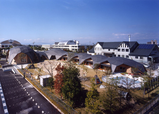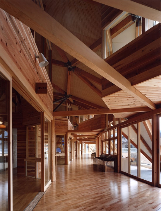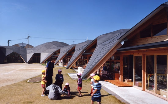maihara幼兒園它位于日本滋賀縣,它的周邊都是一些新建的住宅區。混凝土的盒子由連續的木頭屋頂鏈接為一體,屋頂用連續的三角形的平面構成;它的結構的強度和形狀的連續性有很大的自由度。屋頂使用2.5米長的木梁和六角形的金屬(接頭)配件,工廠預制,現場裝配。木制桁架和混凝土盒子組合出各種各樣的結構表現效果。