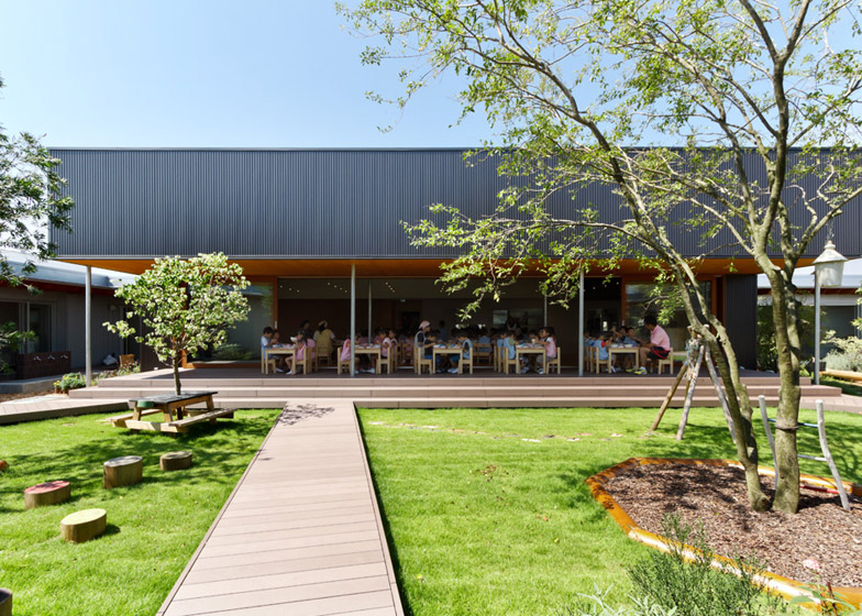 開放的走廊自然延伸至庭院,二者之間的邊界被刻意地模糊。這使得小朋友得以充分擁抱院中的草坪、喬木,并且能在開闊的場地中自由玩耍。這樣的設計,為教育帶來了巨大的變化,當然也正是自由的象征。
