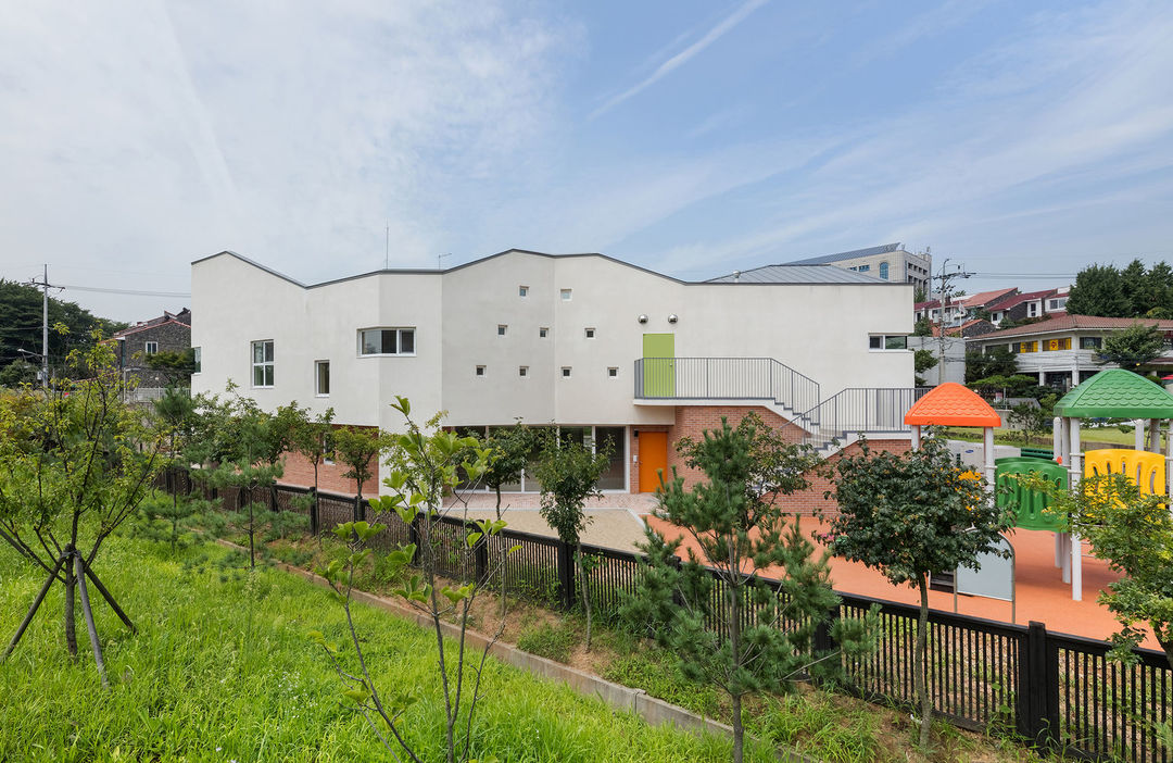這是一家在韓國首爾的幼兒園,外觀上最明顯的標志是不規(guī)則的屋頂,雖然還是用的青瓦,它的起伏和轉(zhuǎn)折并不連貫,倒像是將不同幢房子拼在一起了。每一個房間都只有一種顏色,但光線和轉(zhuǎn)折的墻面讓每個房間都非常獨特,越來越多的幼兒園融入了設(shè)計者對于早期教育的想法。有的放任玩耍,寓教于樂,也有通過建筑設(shè)計來影響兒童的世界觀。