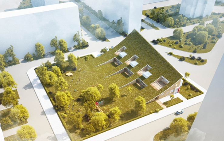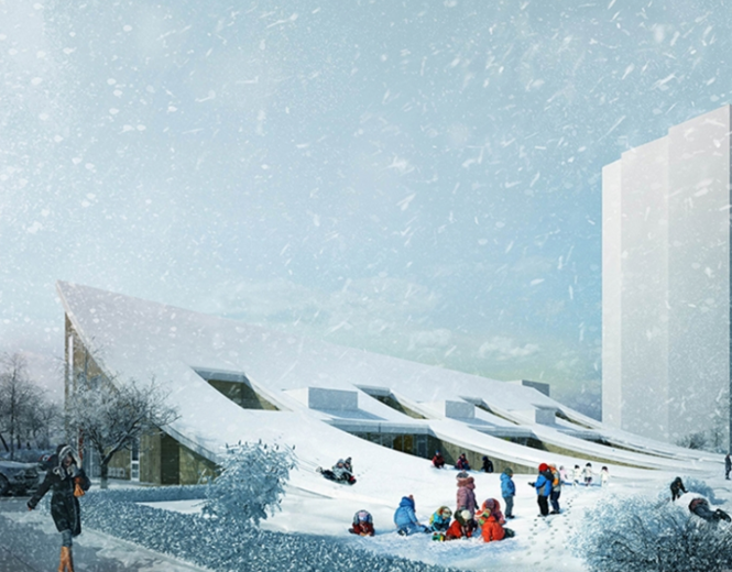 Rastvor的建筑師展現(xiàn)給我們的“山形幼兒園”,傾斜的綠色屋頂好似從地面掀開的一張綠紙,驚鴻一筆卻可以窺視這個因循守舊的規(guī)則街道所賦予城市的無聊紋理,而這些無聊的紋理周而復(fù)始組成了我們賴以生存的城市,從出生到死亡,每個人都屈從于規(guī)則之下,卑微而茍且。Rastvor的構(gòu)圖語言是如此鋒利,使屋頂和地面的界限變得模糊。在街道望向幼兒園,如同一段斷裂的地紋,既給孩子們創(chuàng)造了一個特別的活動空間,更讓人聯(lián)想到孩子們與眾不同的想象力。(幼兒園設(shè)計)