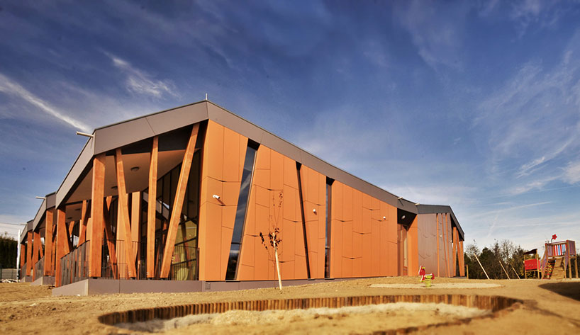 斯洛文尼亞幼兒園Kekec的擴(kuò)建部分。外圍的墻是用彩色玩具木板制成的。天然的木板可以使孩子們?cè)谕嫠V斜孀R(shí)不同的顏色,同時(shí)感受到木頭的天然質(zhì)感。