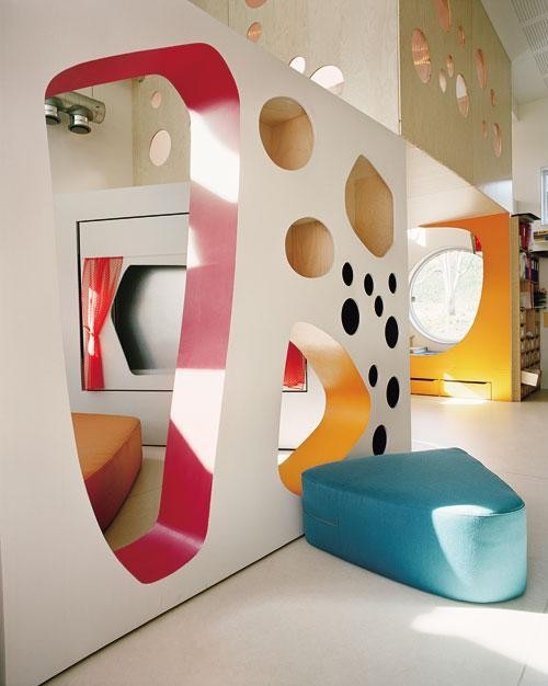 這些墻面包含多種用途——書架,抽屜,公仔秀,黑板,可以拉伸的家具、攀緣墻等等。