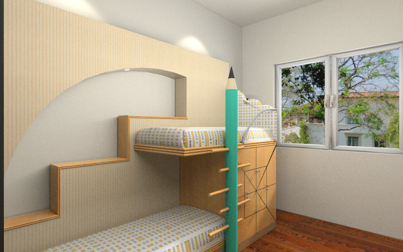兒童臥室設計一:房間過小,但要配置齊全的功能。采用日式拉門衣柜,選用環保材料,確保兒童健康。在房間另一角落安排立體書柜,下面是可調整高度的書桌,連接書桌的是簡單書柜,下面可以擺放一些小孩喜歡的玩具或者閱讀的書籍,方便取用,書桌上再安放一個環保臺燈,給小孩營造一個私人空間。
