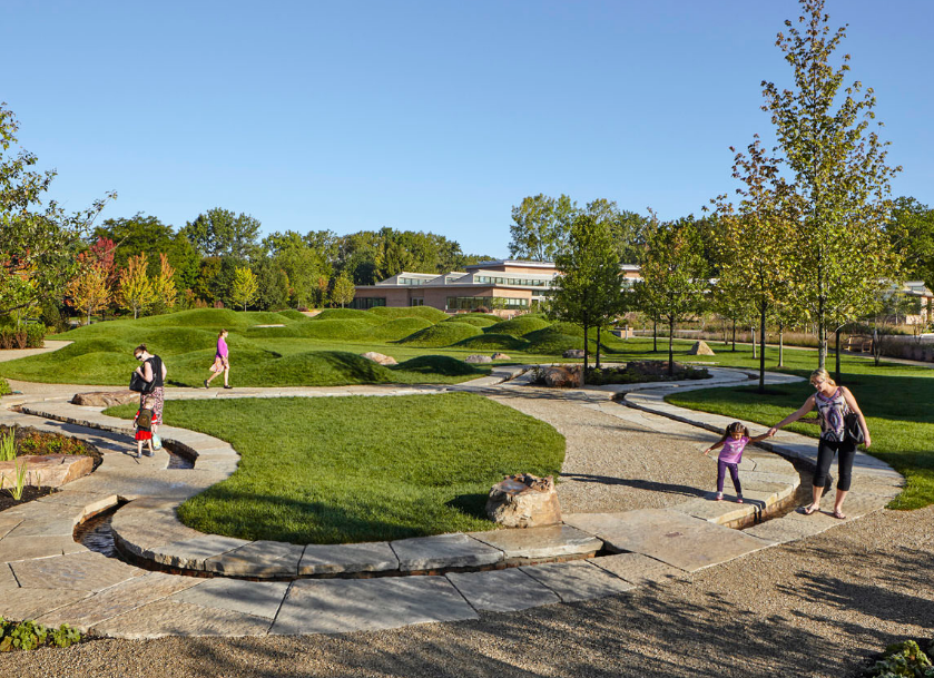 雷根斯坦學(xué)習(xí)園區(qū)是芝加哥植物園新設(shè)的環(huán)境探索中心和自然游樂場。這個(gè)占地六英畝的園藝園區(qū)作為科學(xué)園藝中心,為充滿活力的家庭社區(qū)服務(wù),提供與自然環(huán)境的互動體驗(yàn),每年游客量超過12.5萬人。該設(shè)計(jì)促使家庭和各年齡段兒童參與豐富的戶外體驗(yàn),例如以探索為導(dǎo)向的學(xué)習(xí)和游戲,從而更深入了解生態(tài)系統(tǒng)。廣闊的花園提供各種自然體驗(yàn)和探索活動,游客穿梭在草地、戲水小路、石塊、多樣的林地種植和柳枝隧道中。這個(gè)再生工程被設(shè)想為通向自然世界的門戶,一年四季提供探索與創(chuàng)造的機(jī)會。